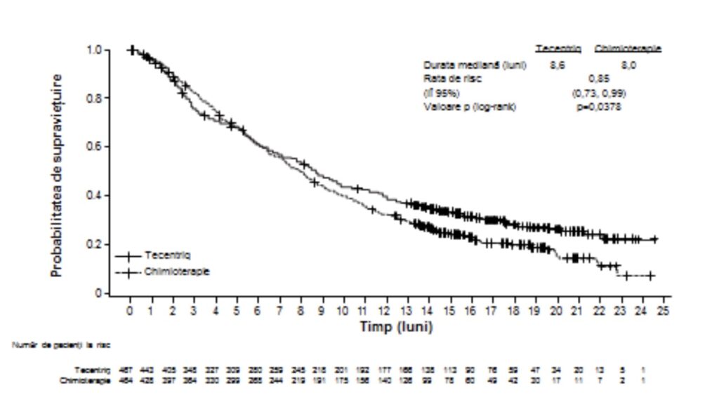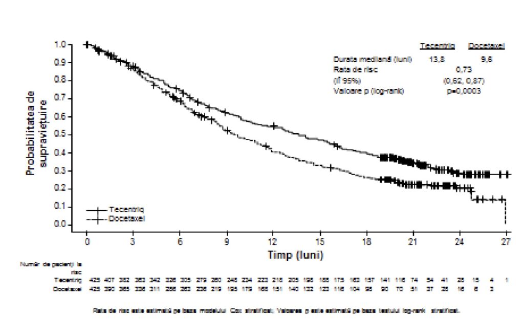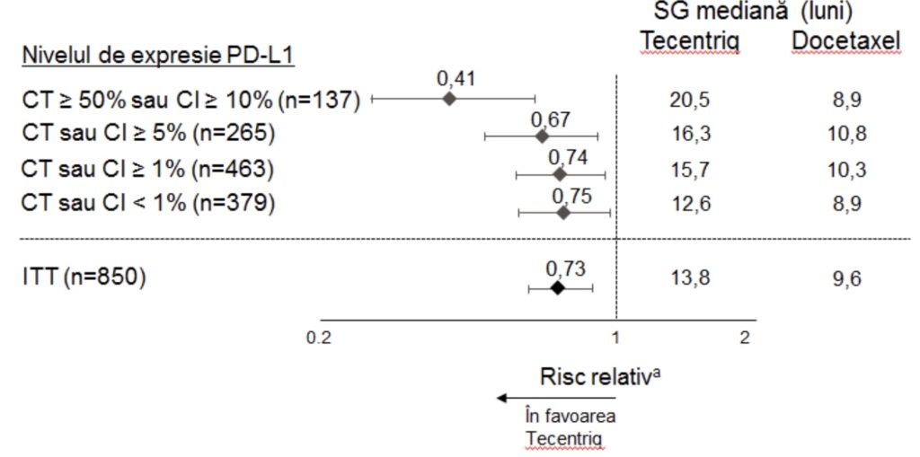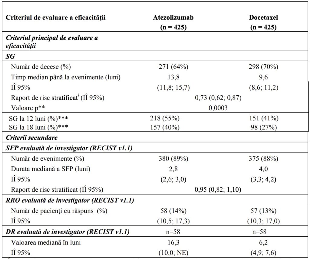 intravenoasă în ziua 1 a fiecărui ciclu de 3 săptămâni, până la progresia bolii). Randomizarea a fost stratificată în funcţie de statusul expresiei PD-L1 la nivelul CI, în funcţie de numărul schemelor anterioare de chimioterapie şi de profilul histologic. O analiză actualizată cu un total de 200 decese observate şi o durată mediană a urmăririi supravieţuirii de 22 luni a indicat o SG mediană de 12,6 luni la pacienţii trataţi cu atezolizumab, comparativ cu 9,7 luni la pacienţii trataţi cu docetaxel (RR de 0,69,