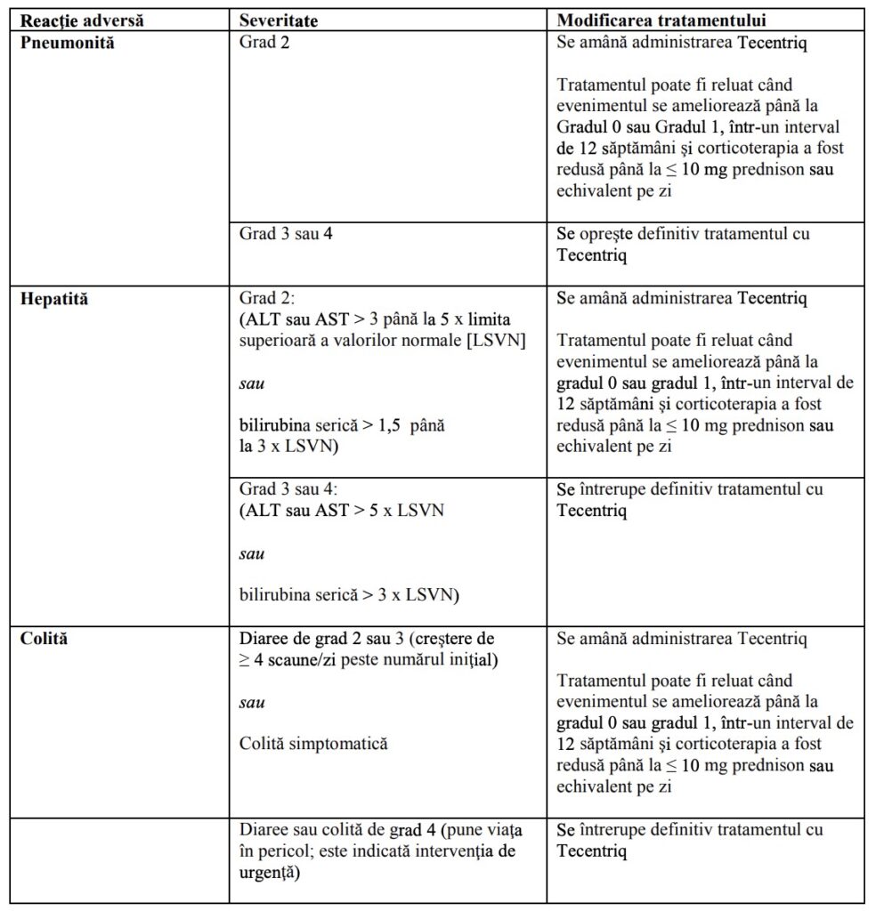 Tratamentul cu atezolizumab trebuie întrerupt definitiv în cazul pneumonitei de grad 3 sau 4.