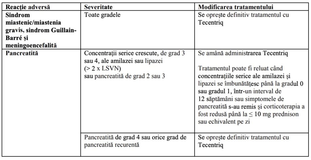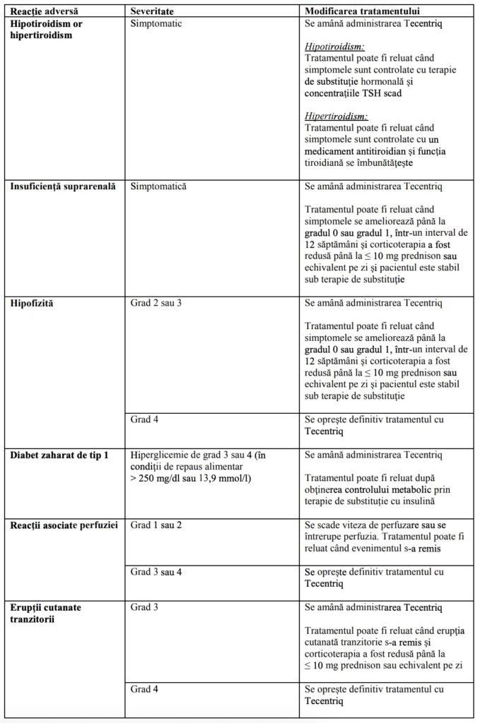 Tratamentul cu atezolizumab trebuie întrerupt definitiv în cazul recurenţei oricărei reacţii adverse mediate imun de grad 3 şi în cazul oricărei reacţii adverse mediate imun de grad 4, cu excepţia endocrinopatiilor care sunt controlate cu tratament de substituţie hormonală (vezi pct. 4.2 şi 4.8).