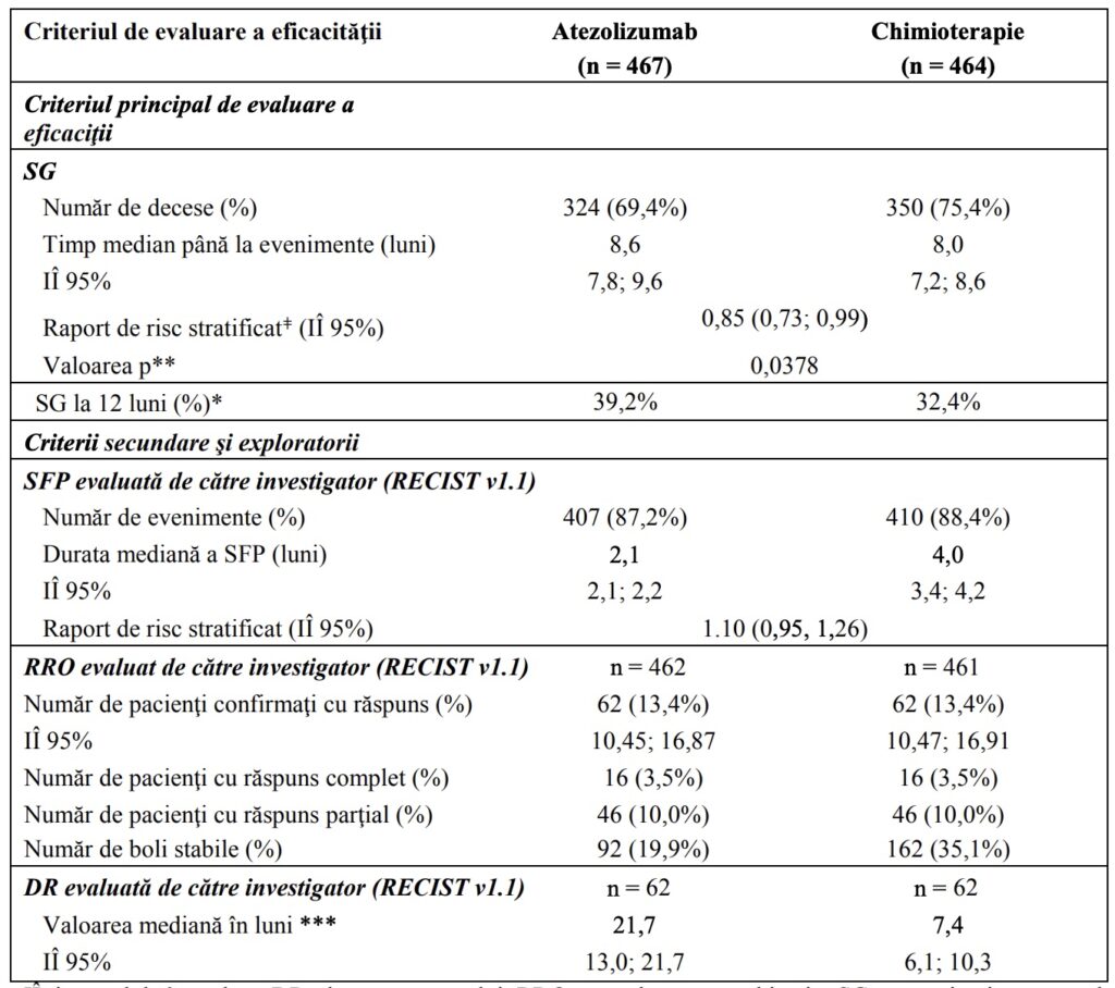 Criteriul principal de evaluare a eficacităţii a fost SG. Rezultatele principale ale acestui studiu cu o durată mediană de urmărire a supravieţuirii de 21 luni sunt prezentate rezumativ în Tabelul 5. Curbele Kaplan-Meier pentru SG în populaţia ITT sunt prezentate în Figura 2. Figura 3 rezumă rezultatele SG în subgrupurile ITT şi PD-L1, demonstrând beneficiul de SG cu atezolizumab în toate subgrupurile, incluzându-le pe cele cu expresie PD-L1 < 1% la nivelul CT şi CI.
