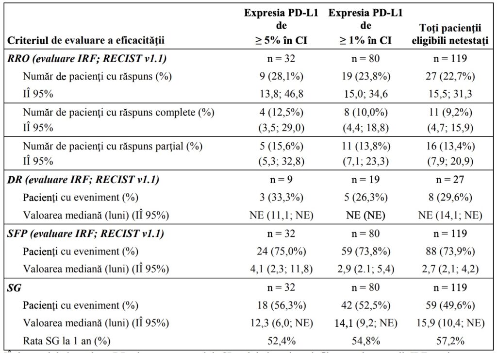 IÎ=interval de încredere; DR=durata răspunsului; NE=nu se poate estima; RRO=rata de răspuns obiectiv; SG=supravieţuirea generală; SFP=supravieţuirea fără progresie; RECIST= Criteriile pentru evaluarea răspunsului în tumorile solide v1.1.